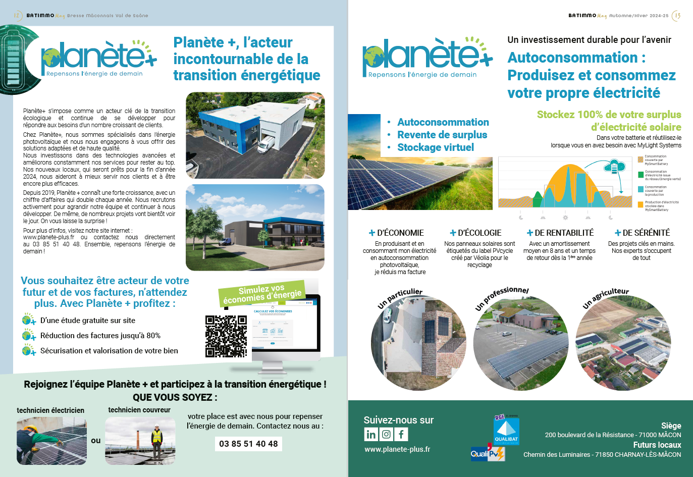 Installée depuis 2019 à Mâcon, la société Planète+ spécialisée dans le photovoltaïque de proximité ne cesse de se développer avec un chiffre d’affaires doublant chaque année. Et rien d’étonnant à cela, car l’entreprise Mâconnaise, forte d’une vingtaine de collaborateurs, propose des solutions de production solaire en autoconsommation et revente totale pour les particuliers comme pour les professionnels…